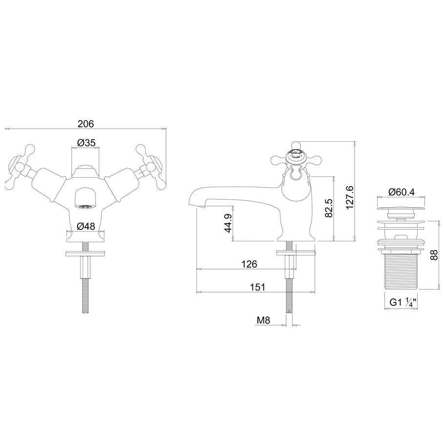 Consists of 1 x Quarter Turn Basin Mixer , with pop up (excluding tap heads & base) Gold (T12-QT GOLD), 1 x Claremont tap handles (pair) Gold (T1 GOLD) and 1 x Click-clack basin waste- Gold (W11 GOLD)