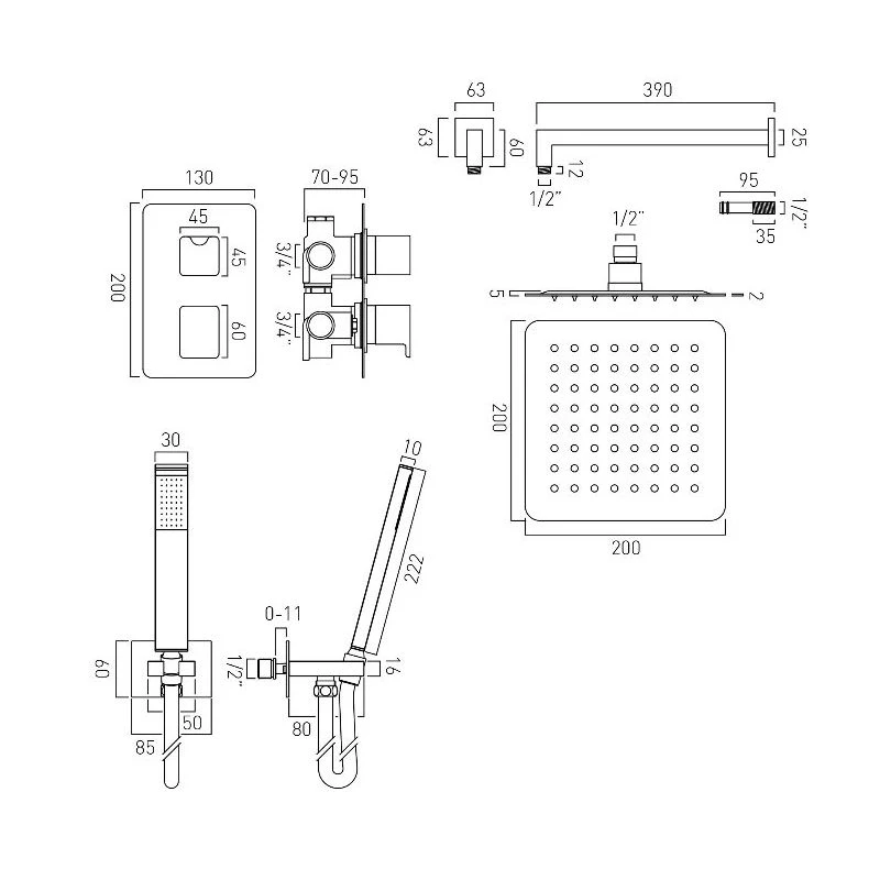 Aquablade 200mm square head with shower arm